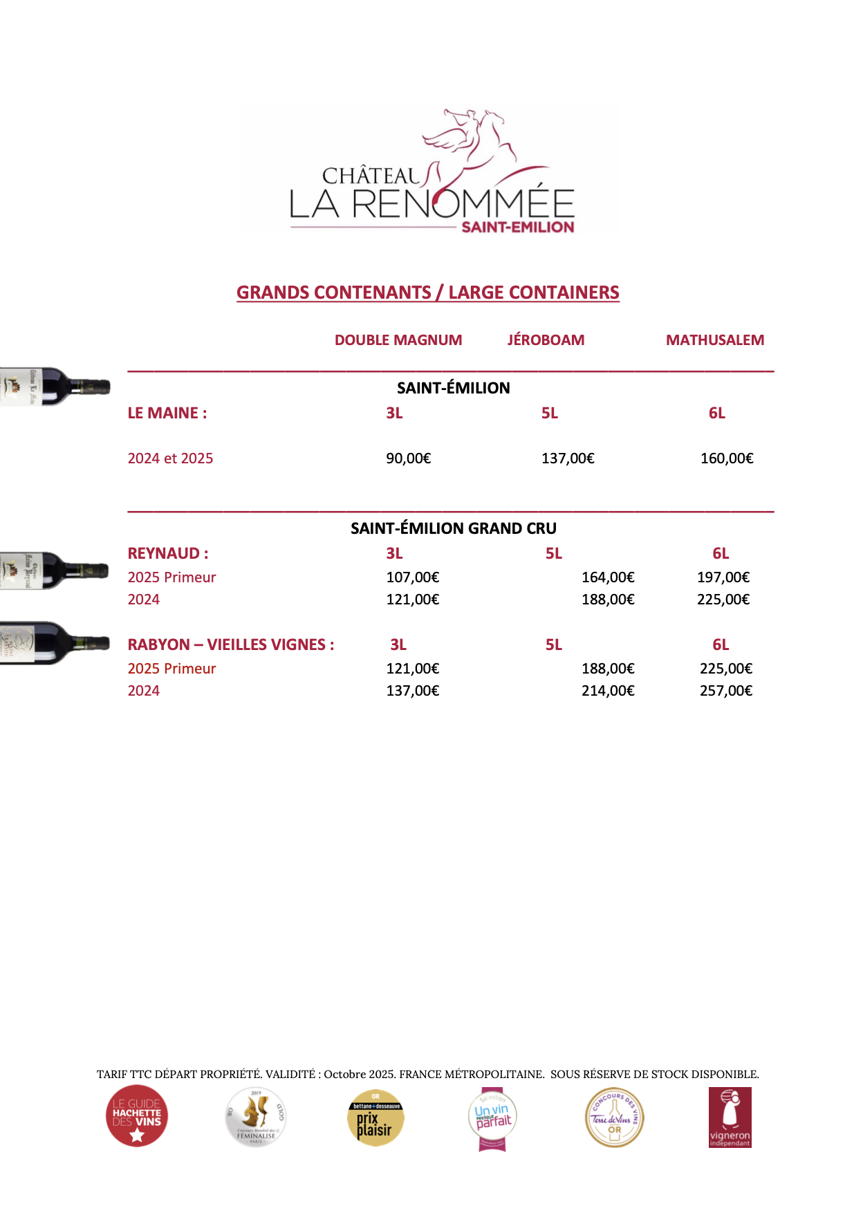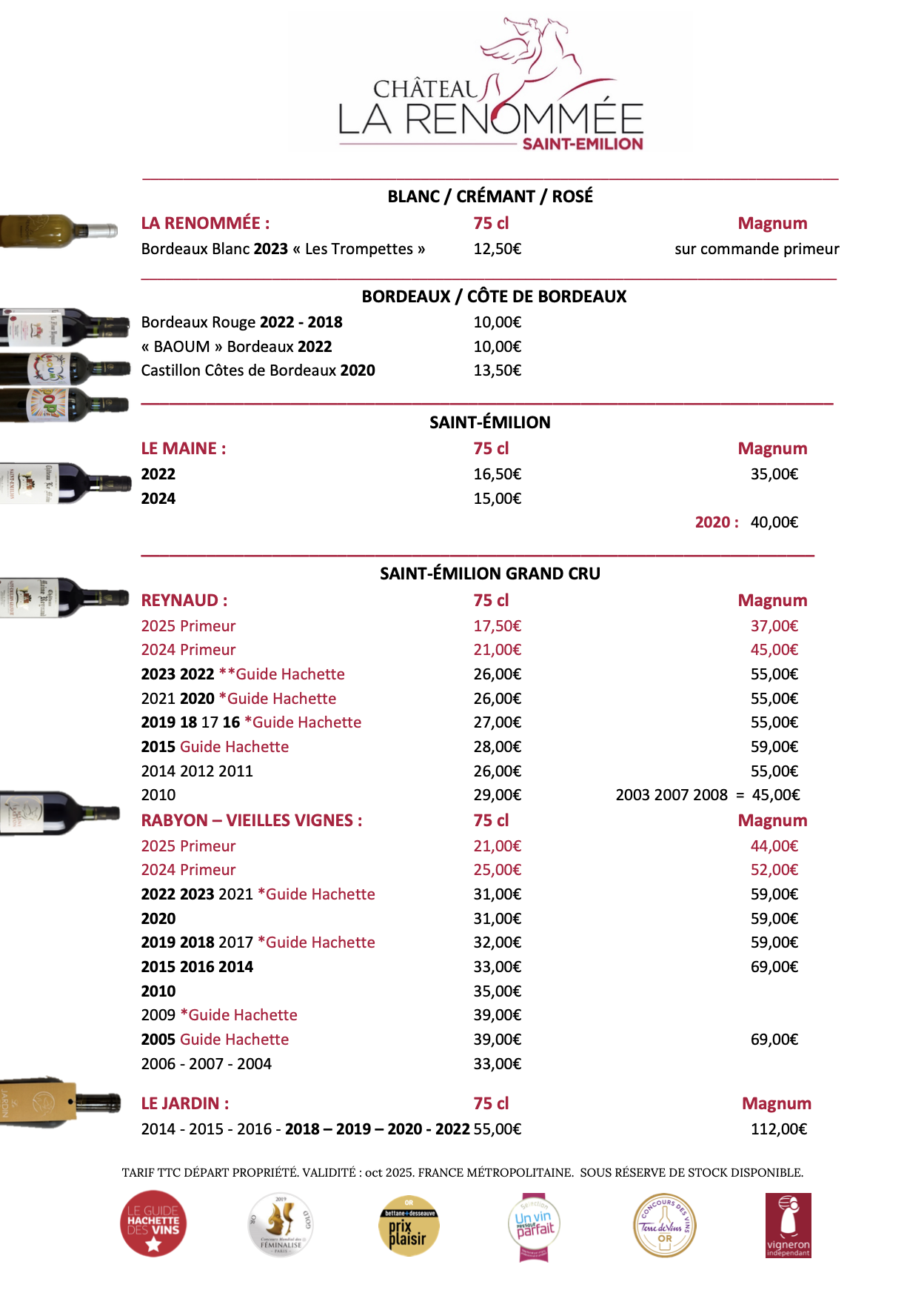 Voici le résumé des tarifs actuels des vins disponibles sur le site
